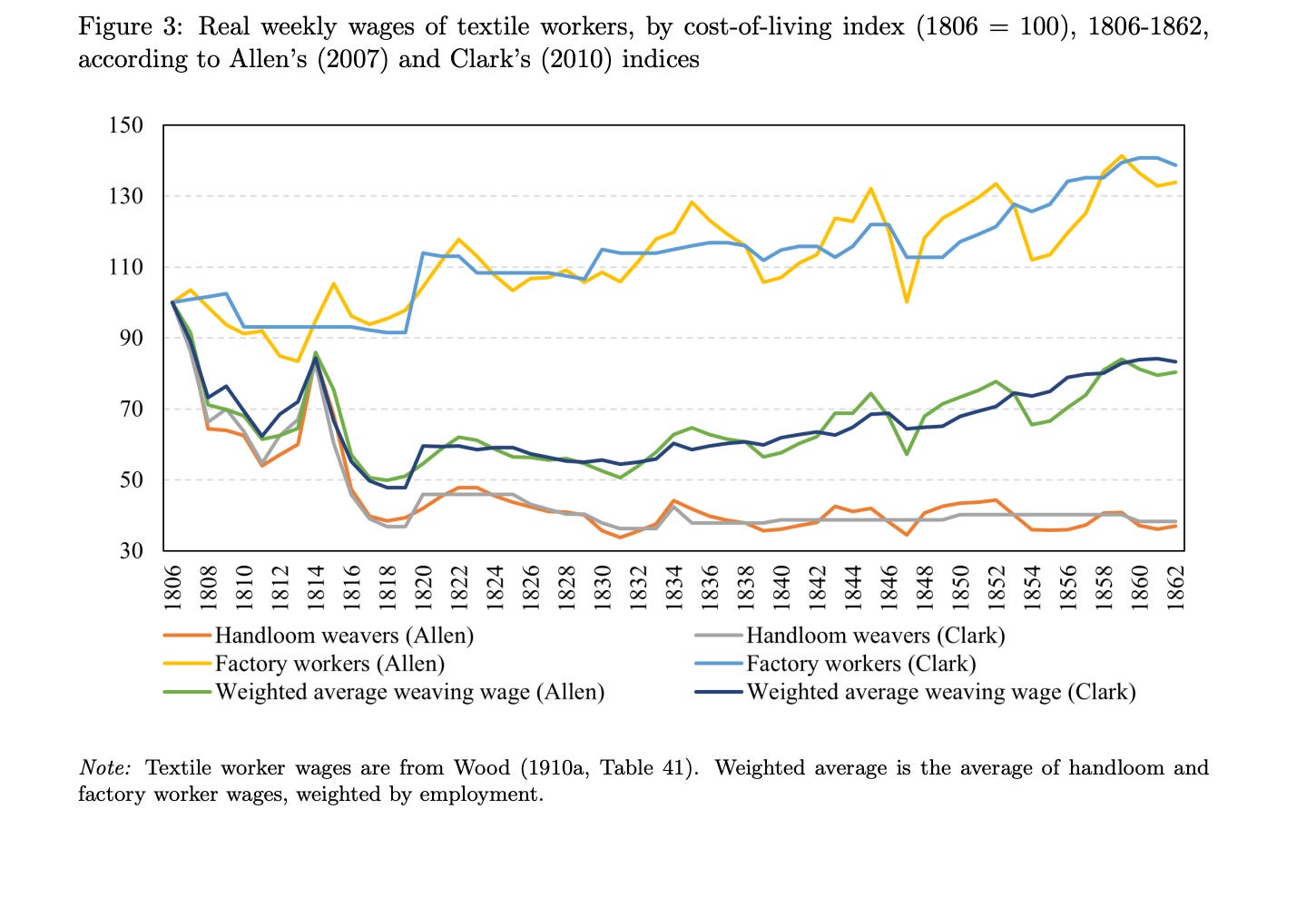 Historical data from the Industrial Revolution shows that even as aggregate textile employment grew, workers shifted between job types within the industry as some roles became redundant. And correspondingly, some jobs saw wages collapse while others saw increases. For example, domestic hand-loom weavers were displaced by power looms and saw their wages collapse, while self-acting mule spinners (a newly created role) and factory workers saw stable employment and steady compensation growth. Additionally, Britain’s deflationary period (1815-1850) saw food prices fall by half, meaning real purchasing power often rose even when nominal wages declined. Despite all this, the psychological reality was harsh. Even with falling prices, watching your paycheck shrink while neighbors lost jobs and debts grew harder to pay (lower wages but fixed obligations) created real instability regardless of aggregate statistics improvements. Also see Acemoglu & Johnson, 2024.