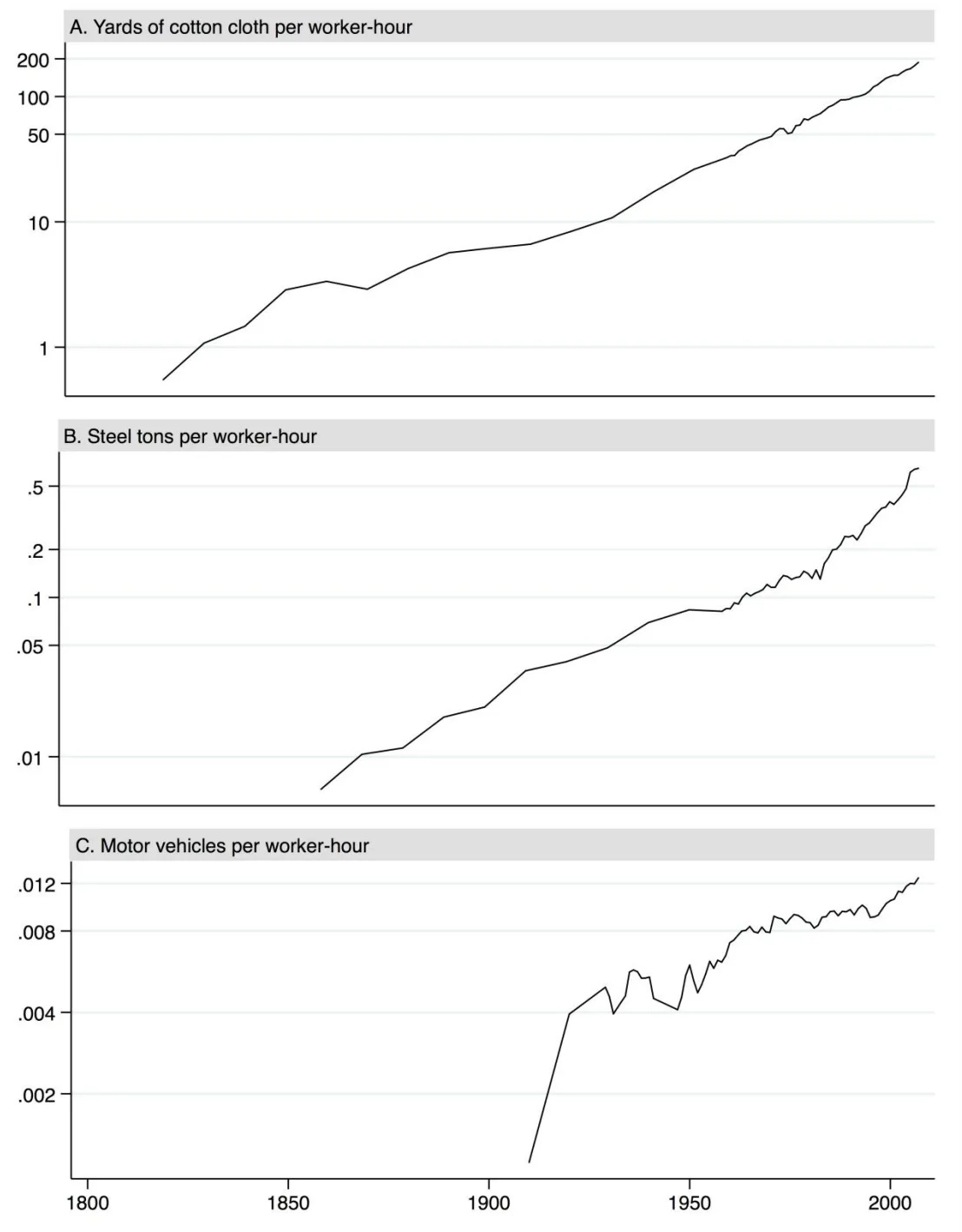 To understand this better, look at what actually happened in three industries over a 200-year period from 1800 to 2000. In the paper Automation and jobs: when technology boosts employment, James Bessen, an economist, shows the employment, productivity, and demand data for textile, iron & steel, and motor vehicle industries.