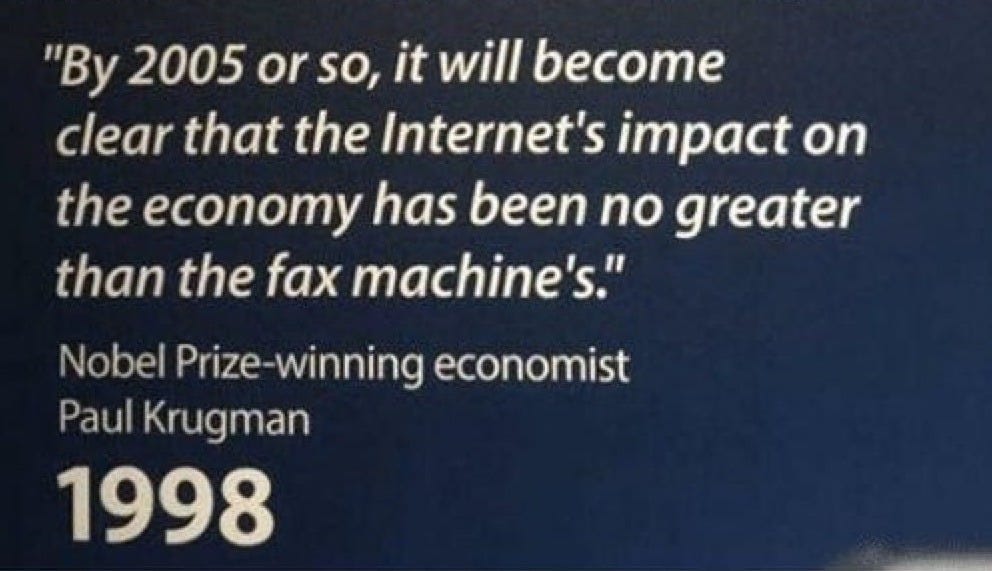 We’re early in the AI revolution. We’re at that metaphorical screeching modem phase of the internet era. Just as infrastructure companies poured billions into fiber optics, hyperscalers now pour billions into compute. Startups add “.ai” to their names like companies once added “.com” as they seek higher valuations. The hype will cycle through both euphoria and despair. Some predictions will look laughably wrong. Some that seem crazy will prove conservative.