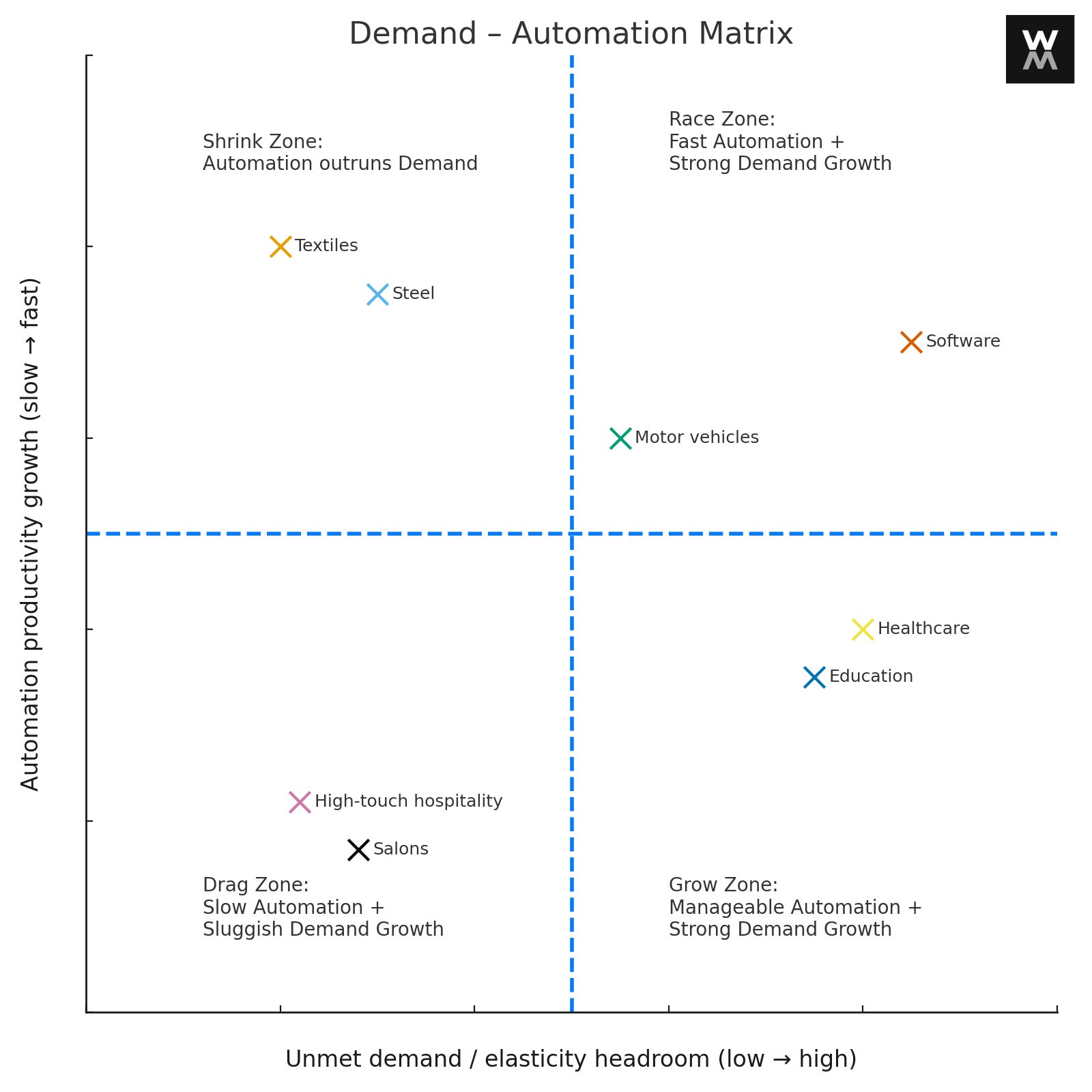 Different industries will experience different outcomes. Unlike what the Jevons optimists suggest, demand for many things plateaus once human needs are met. Employment outcomes in any industry depend on the magnitude and growth of unmet market demand and whether that demand growth outpaces productivity improvements from automation.