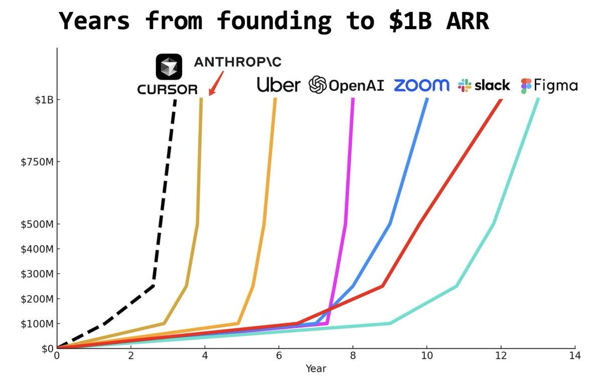 This disclosure means Anysphere Inc. (Cursor’s parent company) is the fastest company in history to reach $1B in annual recurring revenue (ARR). Yes, faster than OpenAI, and faster than Anthropic4.