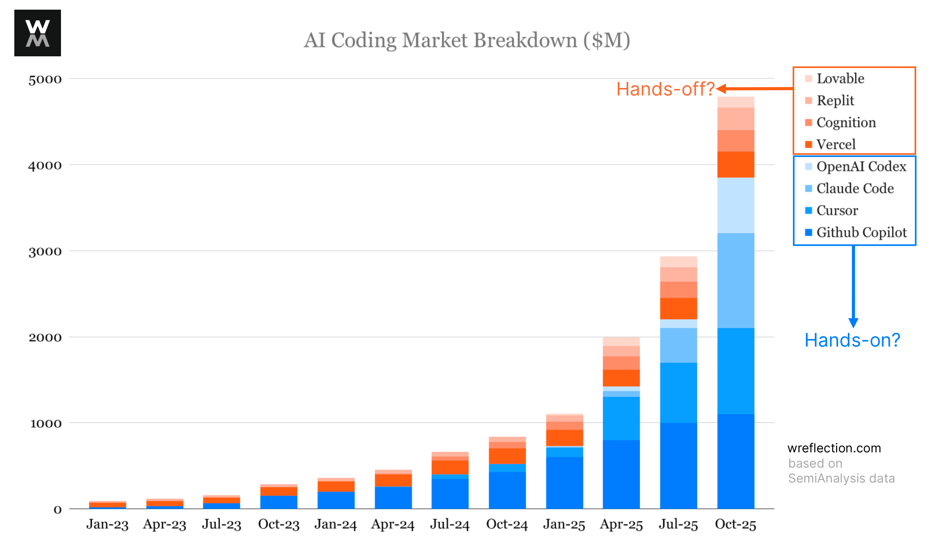 Hands-on: Professional software engineers use these tools in their existing workflow to ship production code. They use AI as an assistant to write boilerplate code, refactor existing services, wire new features or UI screens, and triage bugs in codebases. Cursor, Claude Code, OpenAI Codex, Github Copilot, Cline, AWS Kiro play here. These products live where the work is done, and integrate into the engineer’s workflow. This is, at least as of now, the bigger market segment.