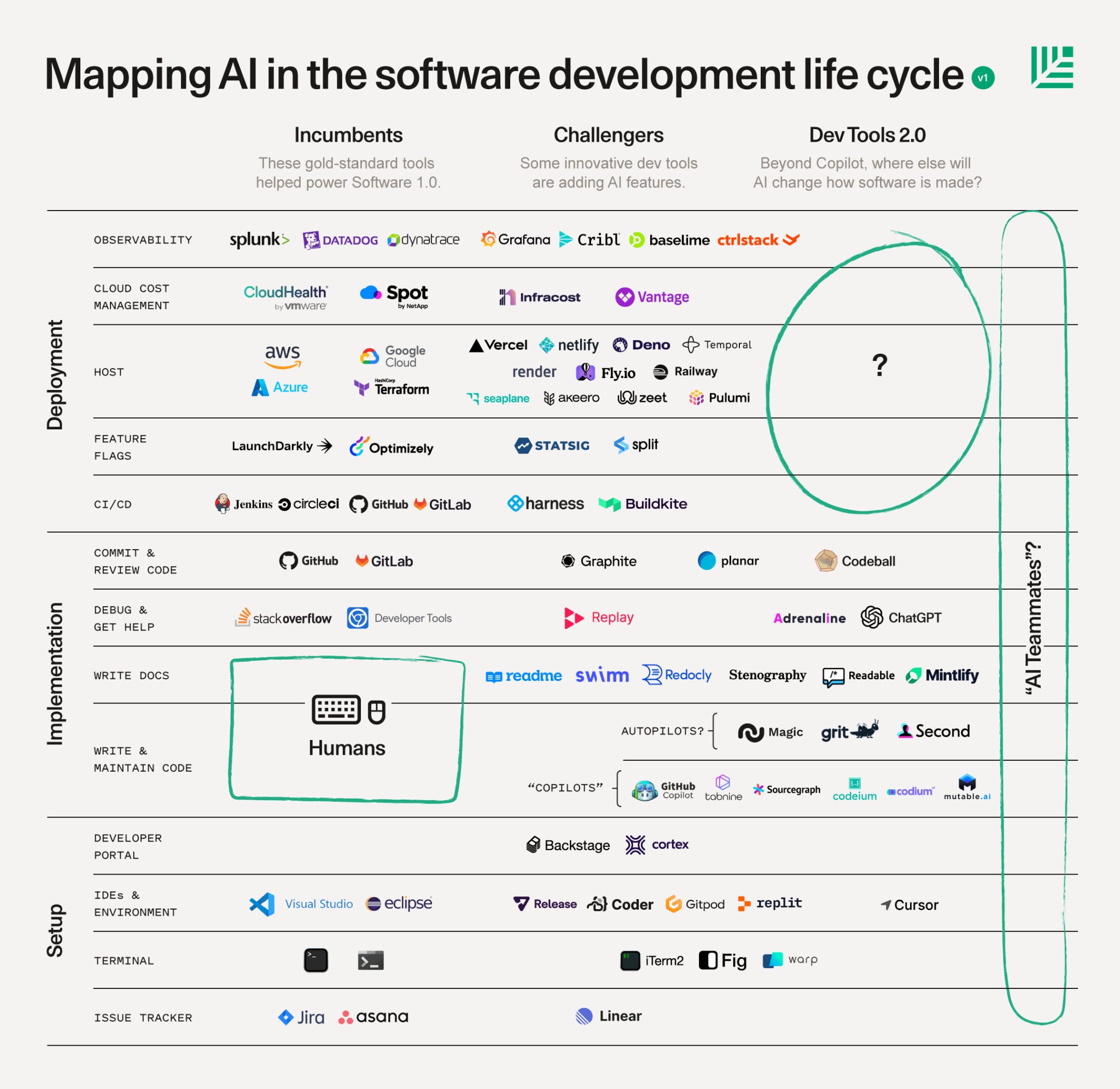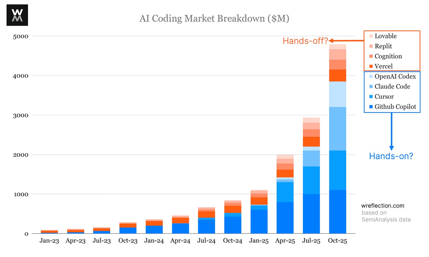 Just as compilers freed programmers from writing assembly code, AI tools are freeing developers from the grunt work of writing boilerplate and routine code, and letting them focus on higher-order thinking. Eventually, one day, AI may get so good that it will generate applications on demand and create entire software ecosystems autonomously. Both hands-off and hands-on tools, as well as incumbents and newcomers, see themselves as the path to that fully autonomous software generation, even if they are taking different approaches. The ones who get there will be those who deliver the best model quality that ships code reliably, go deep enough to ship features that foundational models can’t care enough to replicate, and become sticky enough that users will not leave even when they can10.