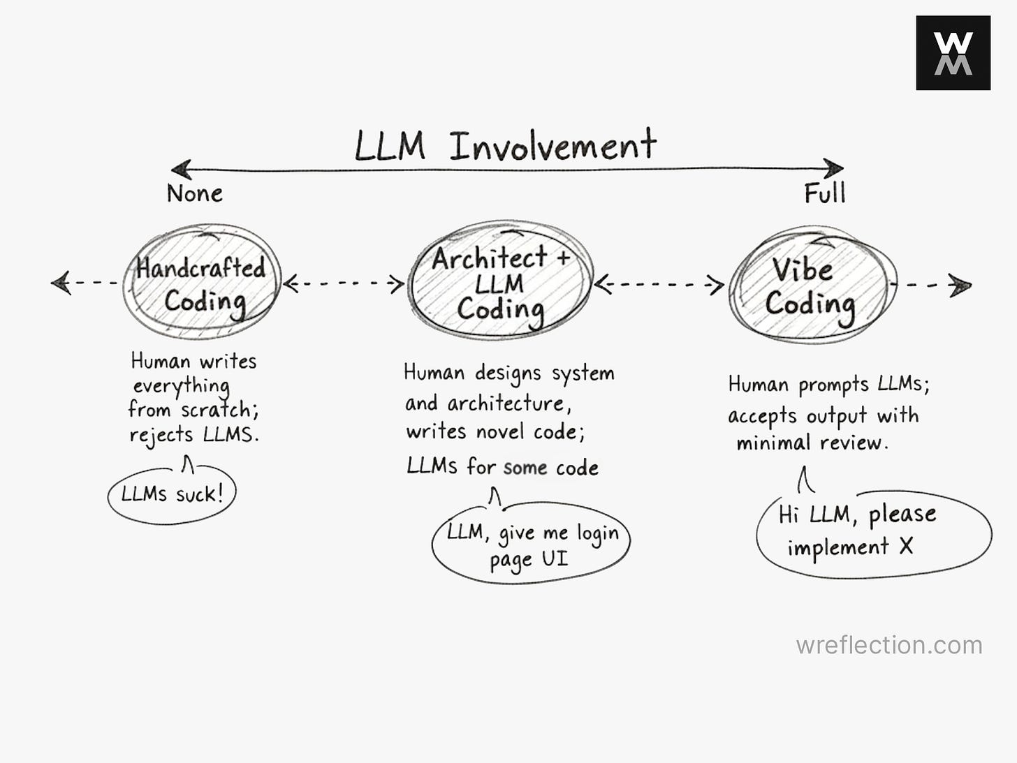 On one end is Handcrafted Coding. These are engineers who actively decline to use LLMs, either because of skepticism about quality or insistence on full control of every code. They argue that accepting AI suggestions creates technical debt you cannot see until it breaks in production. This segment continues to decline as the quality of AI coding models improves.