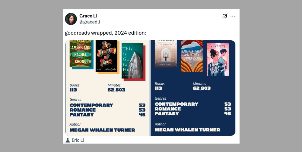 Some products that seem like natural fits for a year-end recap feature are yet to ship one. Kindle and Goodreads are the most obvious candidates to me. Amazon owns both properties and has rich data about reading habits. Yet users have had to resort to creating their own year-end Kindle and Goodreads recaps because the official product does not exist. This seems like a missed opportunity because reading, like music listening, reflects identity and taste.