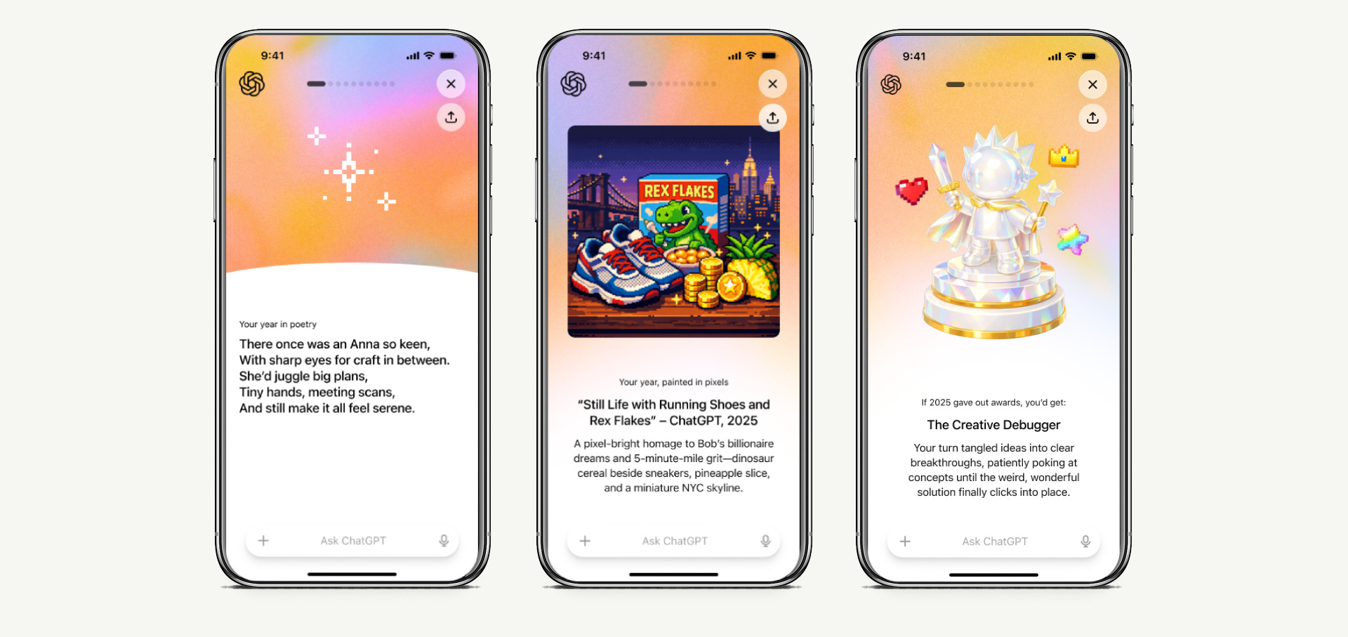 2026, in my view, will likely be the year we will see truly spectacular AI-native wrapped experiences. Granola showed how AI can be used to generate witty summaries of users’ meeting patterns. In the next evolution, one could imagine your favorite artist calling you by name, or previewing a personalized song they’ve created just for you with your name worked into the lyrics. Memory from AI products could draw magical insights about you from completely unrelated conversations, surfacing themes that other apps cannot. Your Year With ChatGPT is an early glimpse of this. These would be orthogonal to what Spotify does.