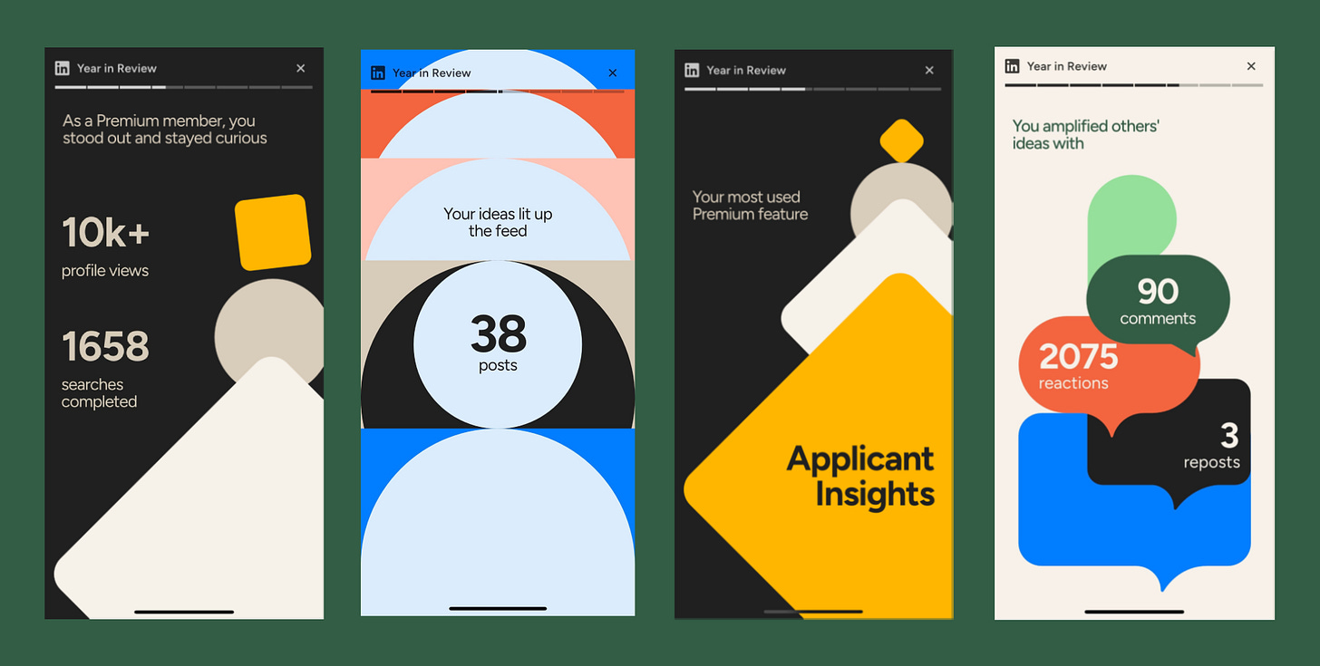Spotify’s Wrapped succeeds in part because it creates social capital. Being in the “top 1% of Swifties” gives users something to brag about and bond over belonging to the tribe. Compare that to LinkedIn’s Year in Review, which tells you that you used “Applicant Insights” frequently. As one user in Lenny Rachitsky’s Slack community5 put it: “I actually have no idea what the applicant insights feature is that apparently I used or the connection between views and searches and premium.” Just because a feature name is well known inside your company does not mean it has similar recognition in customers’ minds. If users don’t even understand it, they won’t get any social validation from broadcasting it.