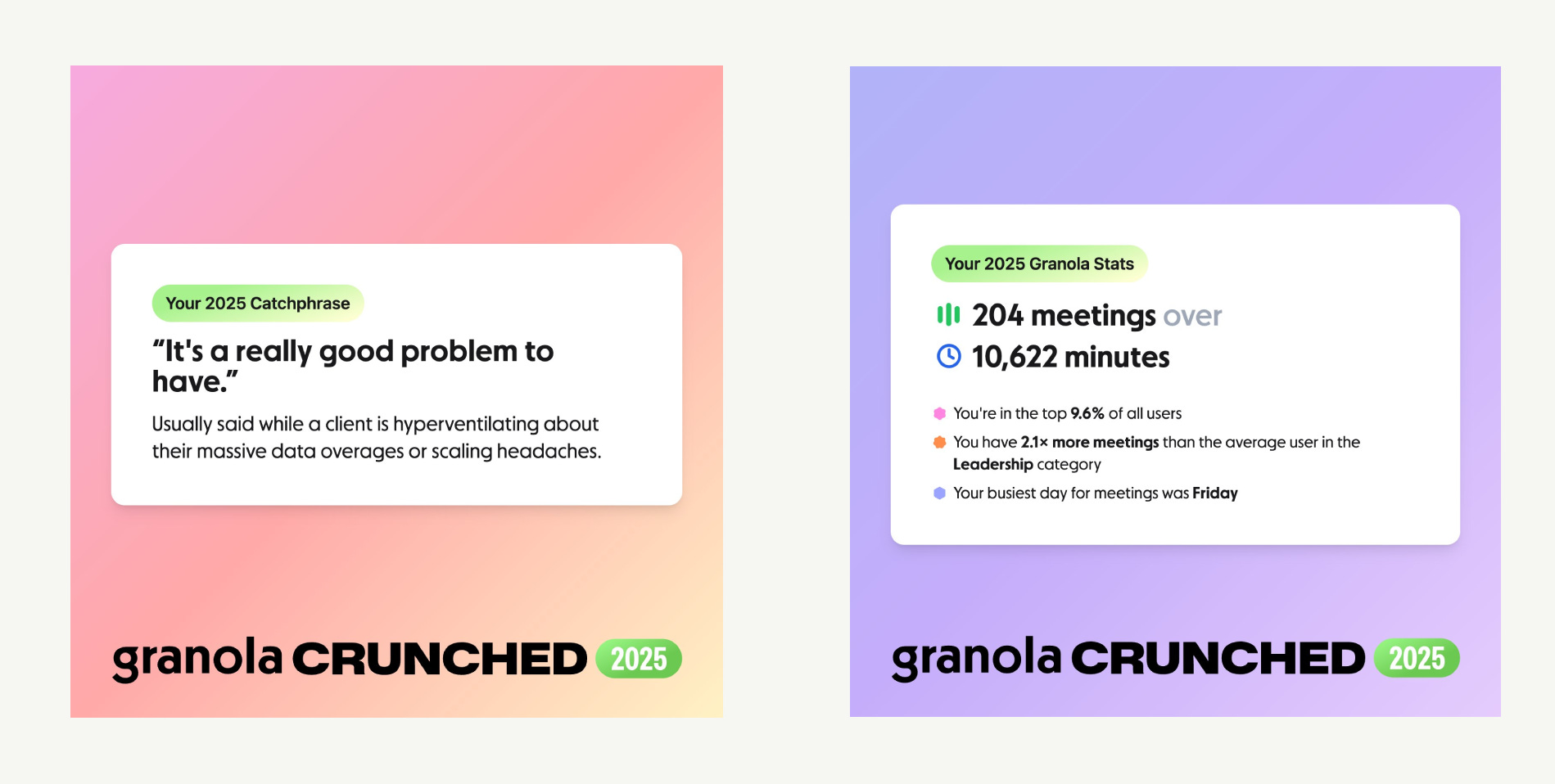 Does year-recap make sense for B2B or work-related products? Generally, no. Most people would not want to know they spent 4,000 hours in Jira, especially if it reminds them they did so because Jira’s errors forced endless troubleshooting. Yet Granola, an AI meetings tool, received notably positive reception for its “Crunched” year-end feature despite being work-related. In the same Lenny’s Slack community discussion from earlier, users reacted to Granola’s ‘Crunched’ feature positively, a stark contrast to their reaction to LinkedIn’s recap. “Just in the Lenny community we have so many people talking positively about Granola. In a crowded AI meetings tools market, that’s massive.” versus “The LinkedIn one was awful. Graphics were bad, wasn’t fun, wasn’t useful.” The difference may be that Granola focused on entertaining AI-generated summaries with simple/minimal raw statistics.